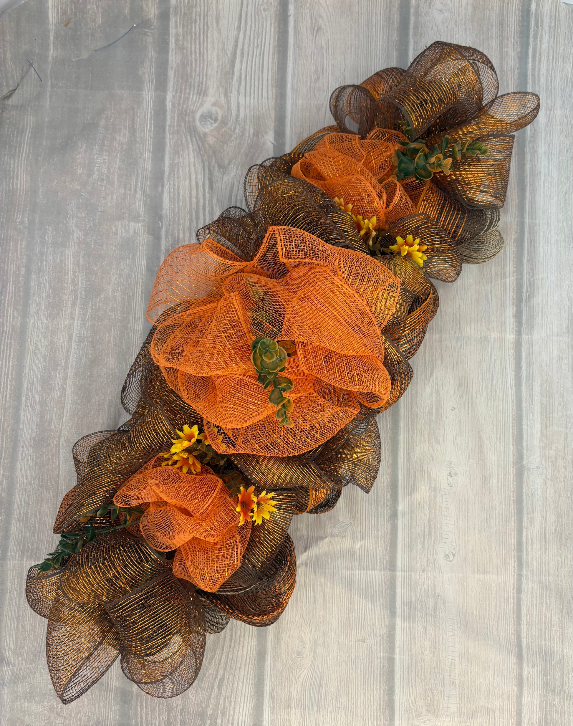 This versatile swag features shimmering copper mesh laced with vibrant orange poufs, lifelike greenery, and golden sunflower blooms. Whether styled across a mailbox, draped over a door, or used as a table centerpiece, this piece brings a brilliant pop of color and cozy autumn cheer.
