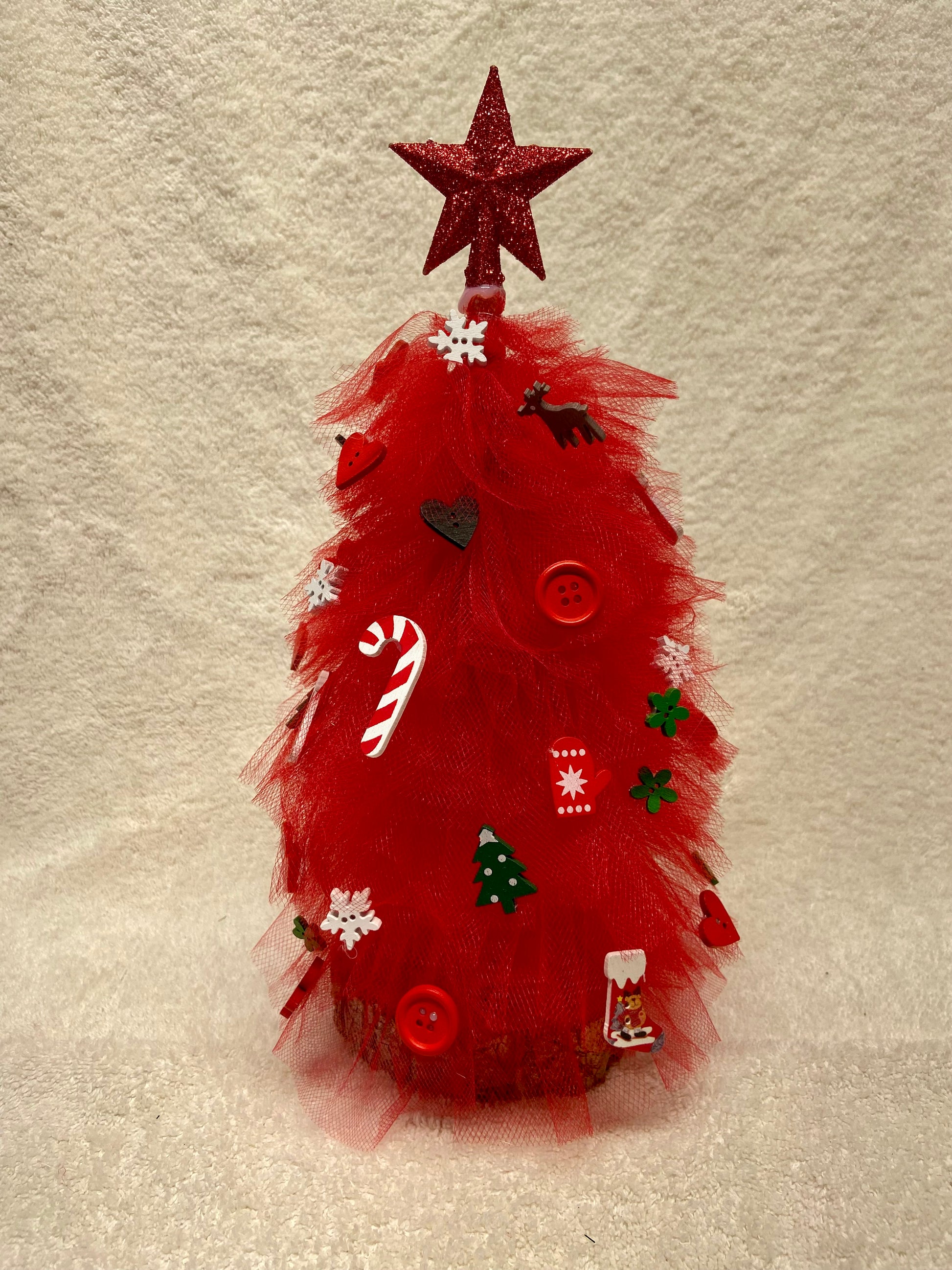 Deck your tabletop with a pop of holiday cheer! This handcrafted 13-inch Cherry Snowfall tree is bursting with yuletide spirit, wrapped in layers of bright red tulle and adorned with playful embellishments like snowflakes, candy canes, buttons, and a glittering red star. Perfect for mantels, entryways, or festive centerpieces.