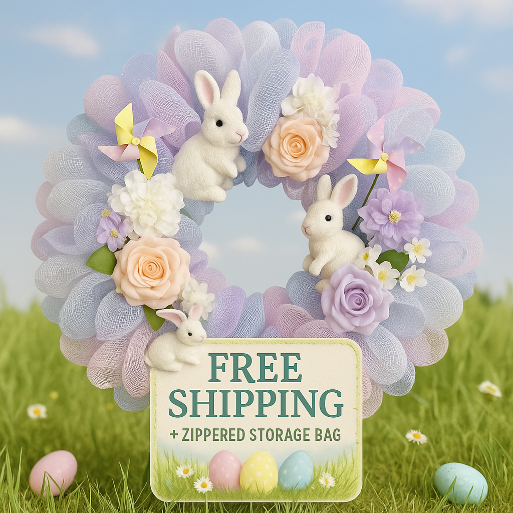Hop into spring with the Bunny Meadow Wreath, a 24-inch burst of Easter joy! Made with lush green mesh loops and sprinkled with pastel pinwheels, gingham ribbons, and tiny speckled eggs, this wreath is full of playful charm. At the center, a sweet bunny family nestles among spring blooms, bringing the magic of an Easter garden right to your door.