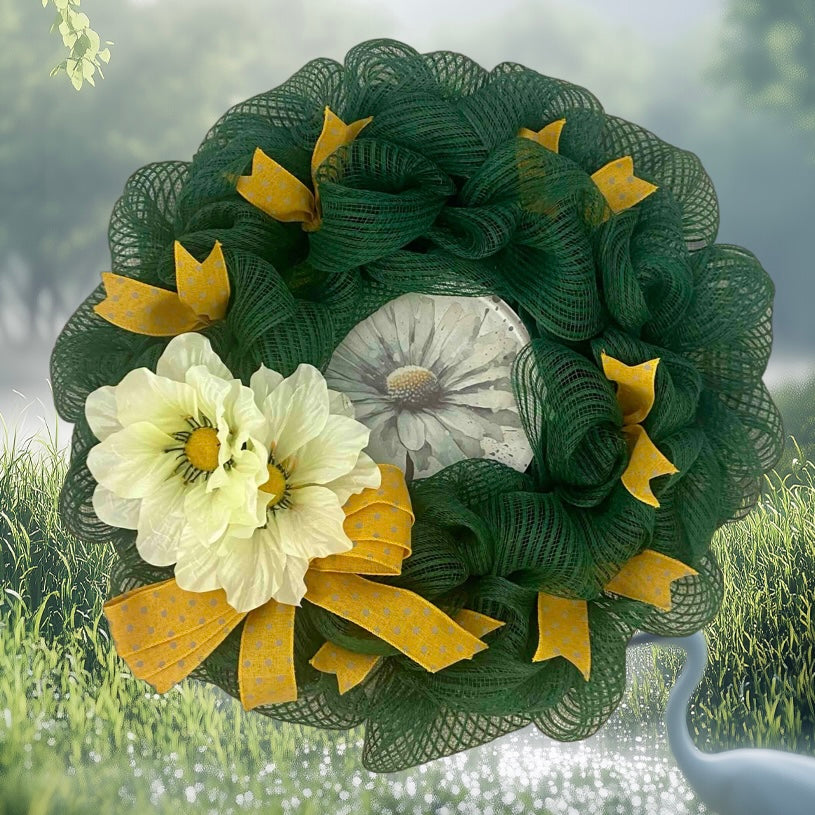 Capture the serene whispers of summer with our Golden Garden Whisper Wreath, a graceful 23-inch design that radiates timeless charm. Rich forest-green mesh forms the lush backdrop, adorned with soft cream poppies and cheerful golden polka-dot bows. A hand-painted floral centerpiece evokes the charm of a hidden summer garden, perfect for brightening up doors, porches, or cozy interiors.