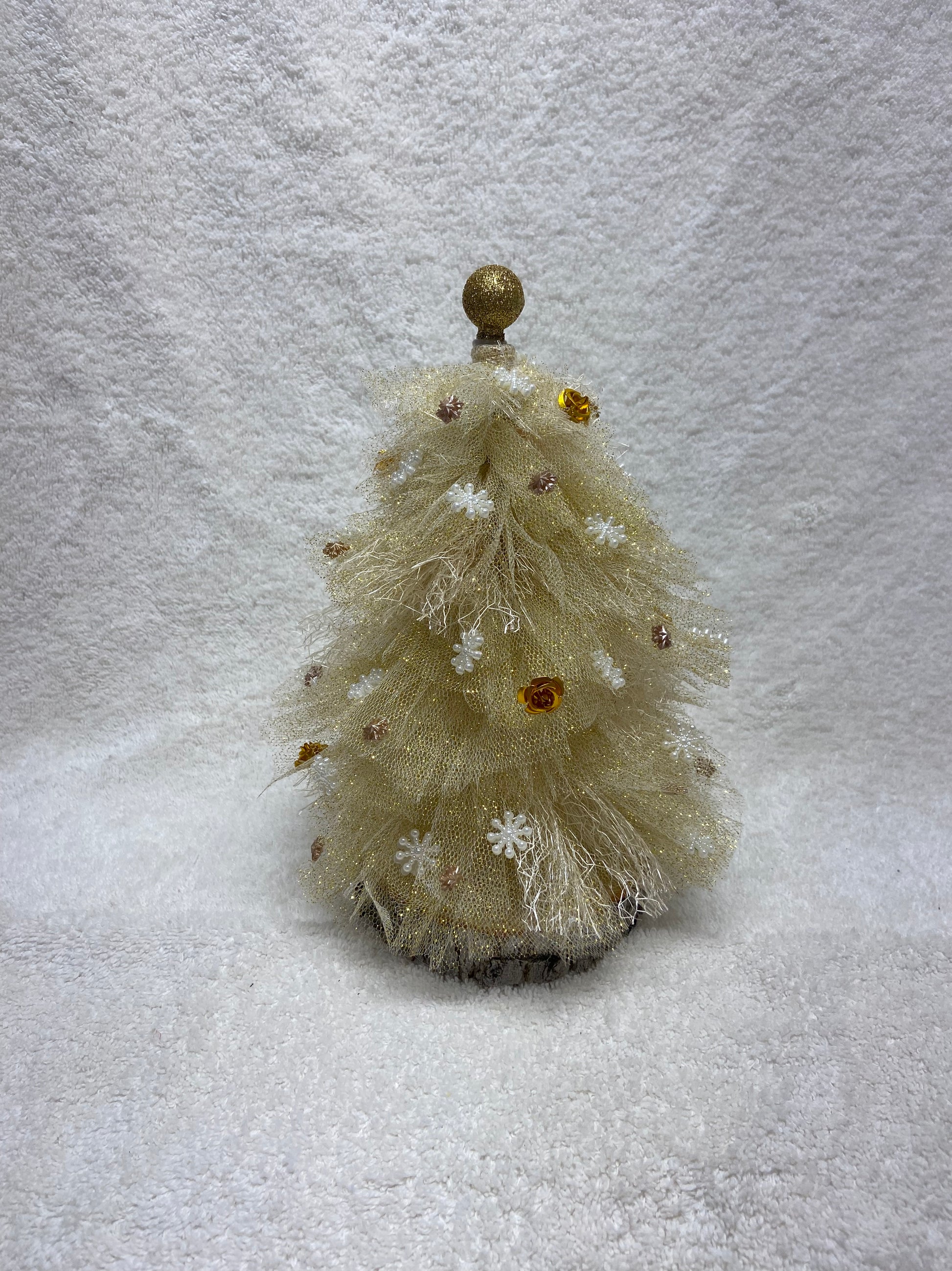 Meet **Golden Sugarplum**, a radiant Whimsy Tree shimmering in soft champagne gold tulle with delicate snowflakes, golden roses, and warm amber accents. A sparkling golden globe tops her crown, bringing an air of timeless elegance and a hint of holiday magic to any space