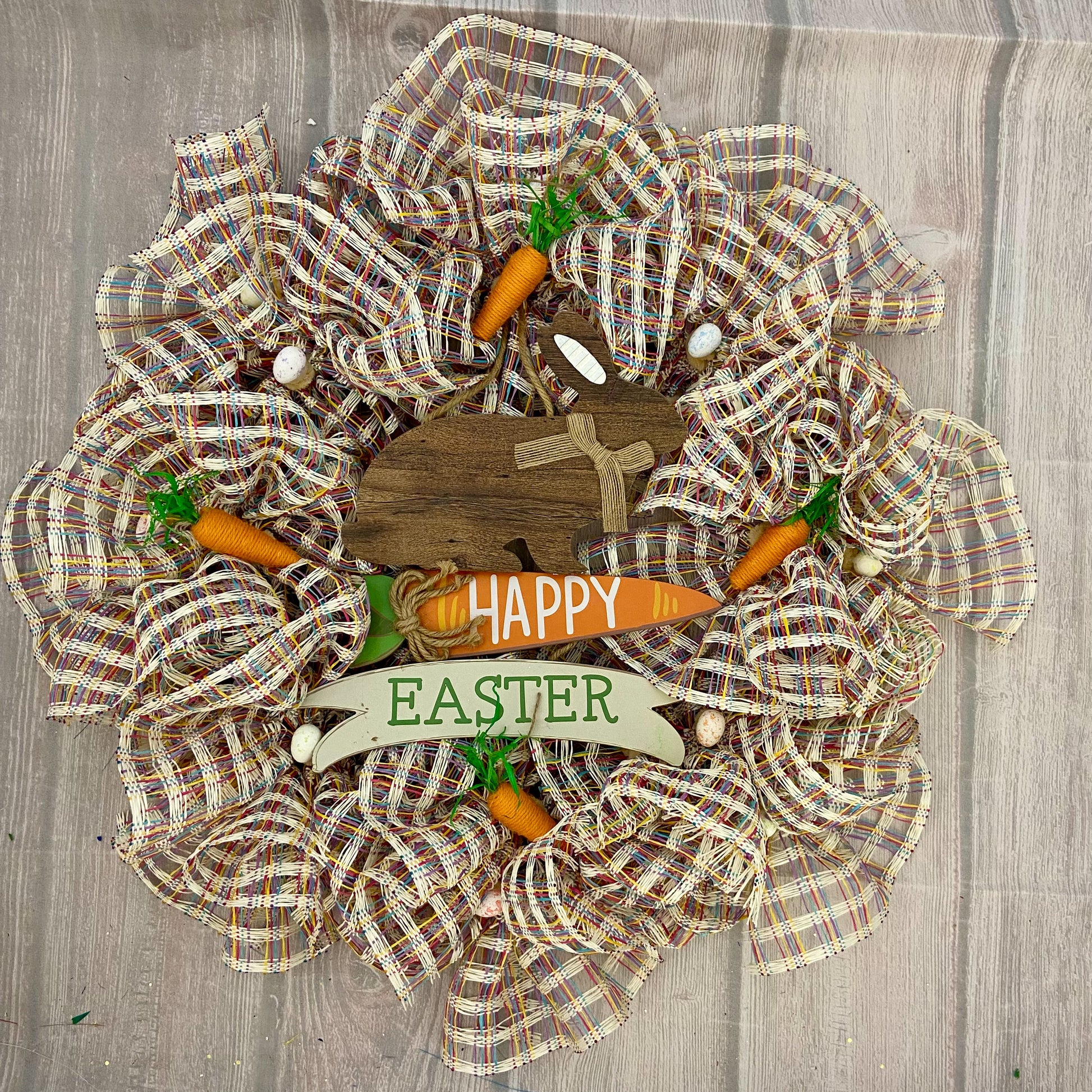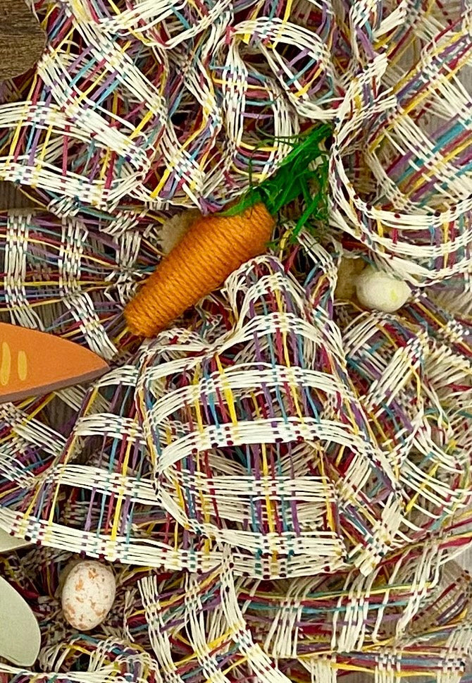 • Features layered plaid mesh, faux carrots, speckled eggs, and a wooden bunny