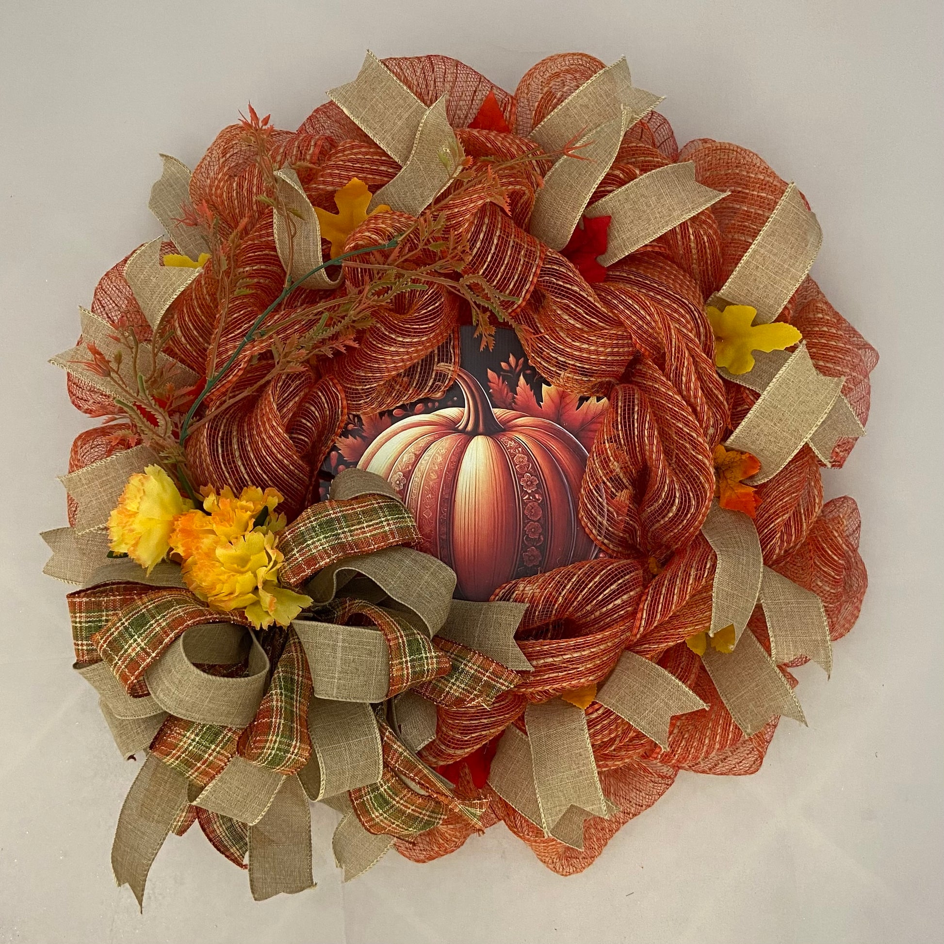 Welcome the season of cider and golden leaves with “Harvest Whisper,” a 23” pumpkin wreath that captures the warmth of autumn in every ribbon. Handcrafted in glowing shades of burnt orange, burlap, and plaid, it centers on a richly illustrated pumpkin—etched with gentle floral detail and framed by soft foliage, bows, and blooms.