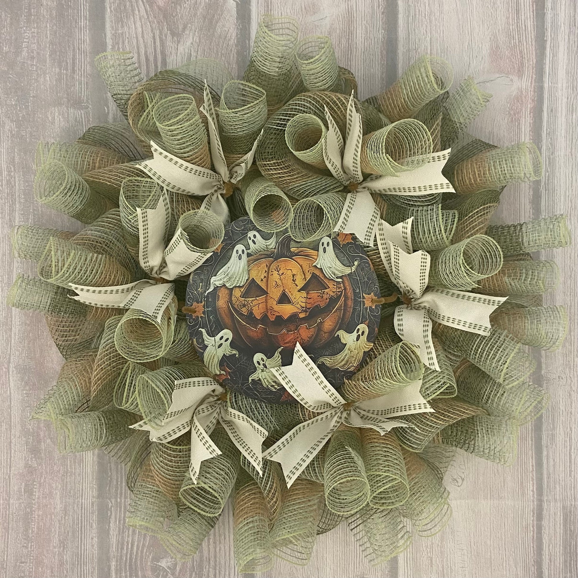 Celebrate the spooky season in charming farmhouse style with our Haunted Harvest Pumpkin Wreath, a bewitching 24-inch wreath that blends eerie fun with rustic flair. Layers of earthy green and brown mesh create a cozy autumn base, accented with stitched farmhouse-style bows. At the heart of this wreath, a grinning jack-o’-lantern surrounded by playful ghosts sets the stage for a whimsical Halloween welcome.