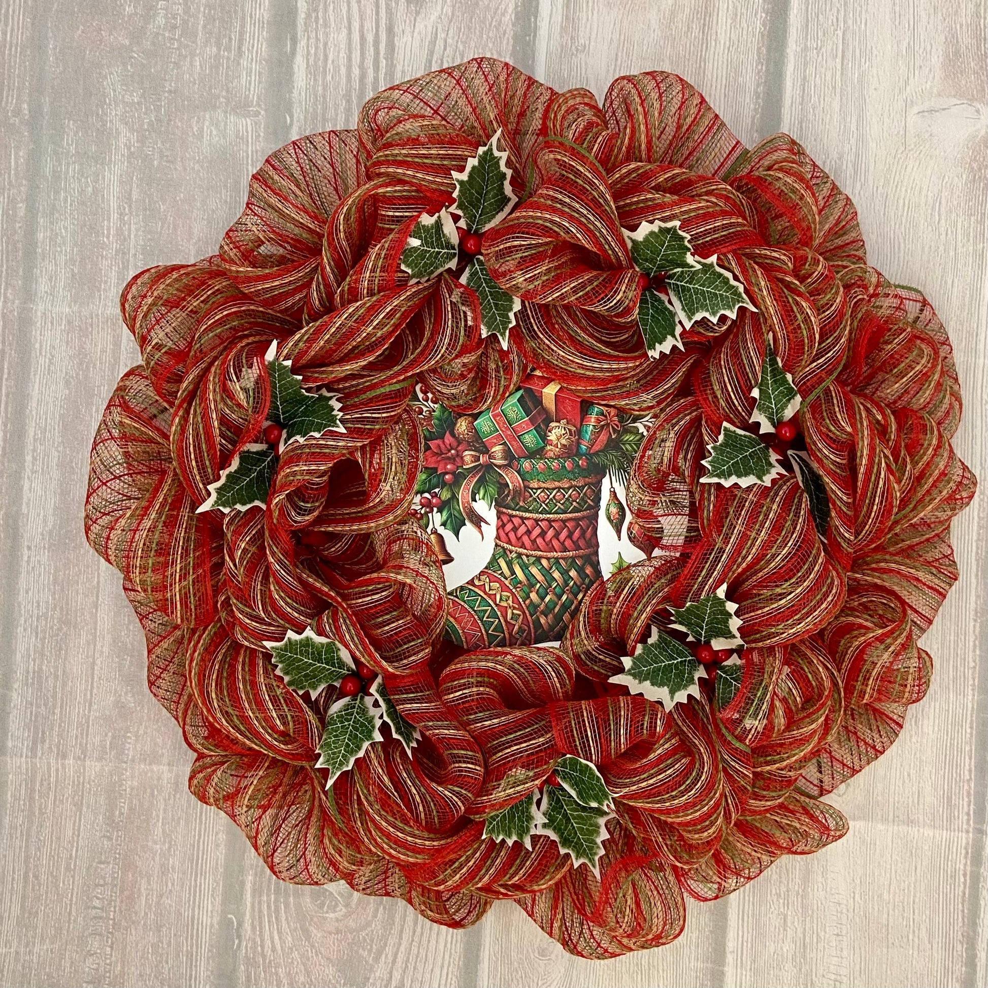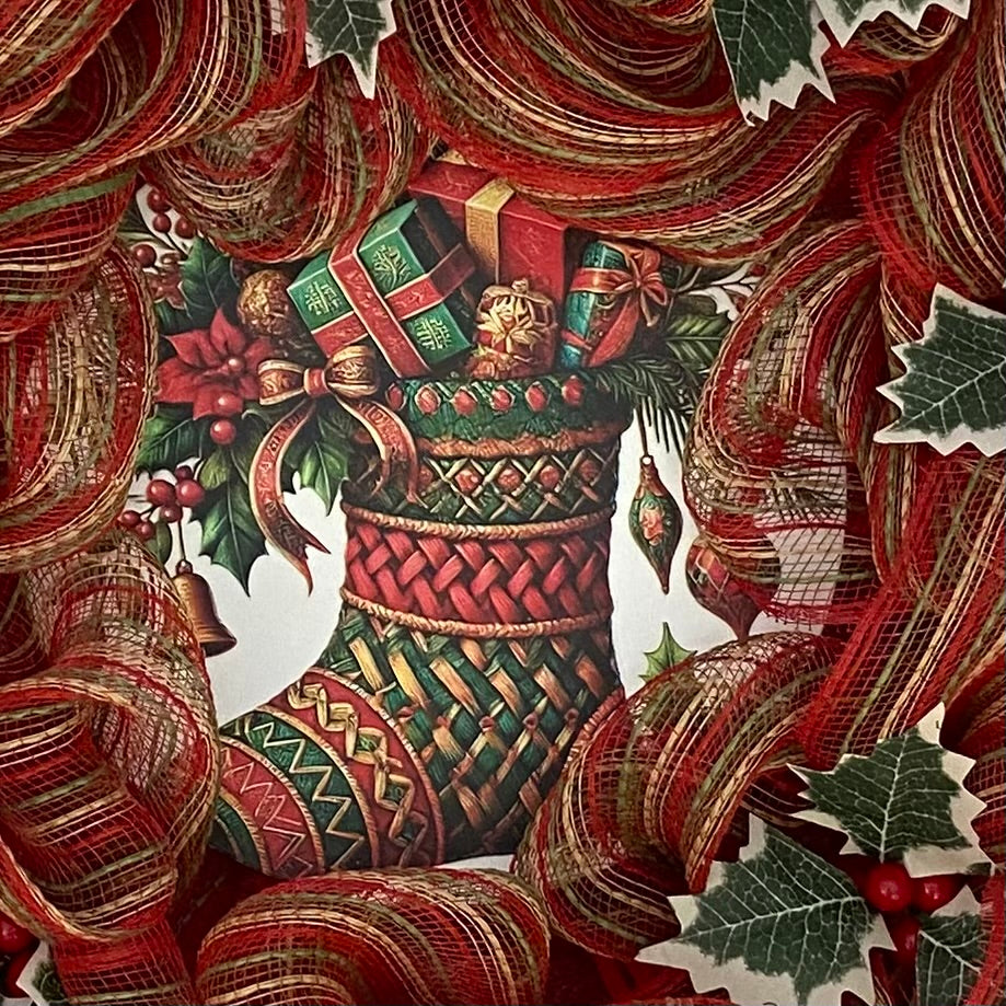 Celebrate the season with classic Christmas charm. The Holiday Hearth Wreath is a rich and radiant 25-inch creation featuring bold red and gold striped mesh loops and holly sprigs with ruby-red berries. At its heart is a festive illustration of a regal Christmas stocking brimming with holiday greenery and gifts—adding a nostalgic touch to any front door, mantel, or entryway. A sophisticated yet whimsical wreath that feels like Christmas morning.