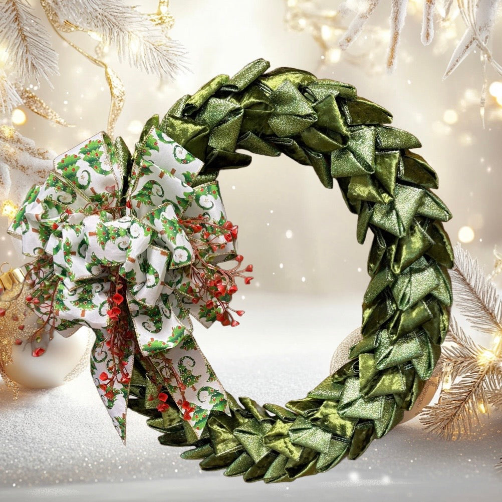 Bring timeless holiday charm to your door with our Holly Velvet Wreath, a 22” handmade beauty crafted from rich green velvet ribbon folded in a stunning chevron braid.