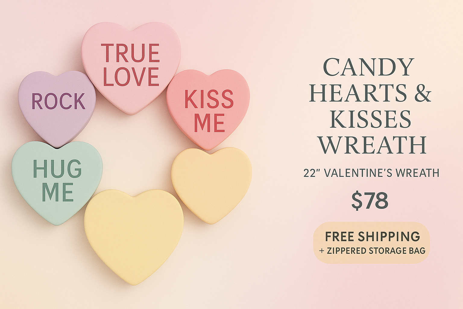 Sweeten your space with the playful charm of the Candy Hearts & Kisses Wreath. This 22-inch Valentine’s Day wreath is bursting with pink, green, and iridescent striped mesh, tied with romantic bows and tiny yellow blooms. At the center, a heart-filled sign featuring classic candy heart phrases—“XOXO,” “Kiss Me,” “True Love,” and more—adds a nostalgic touch of love. It’s as fun as it is festive!