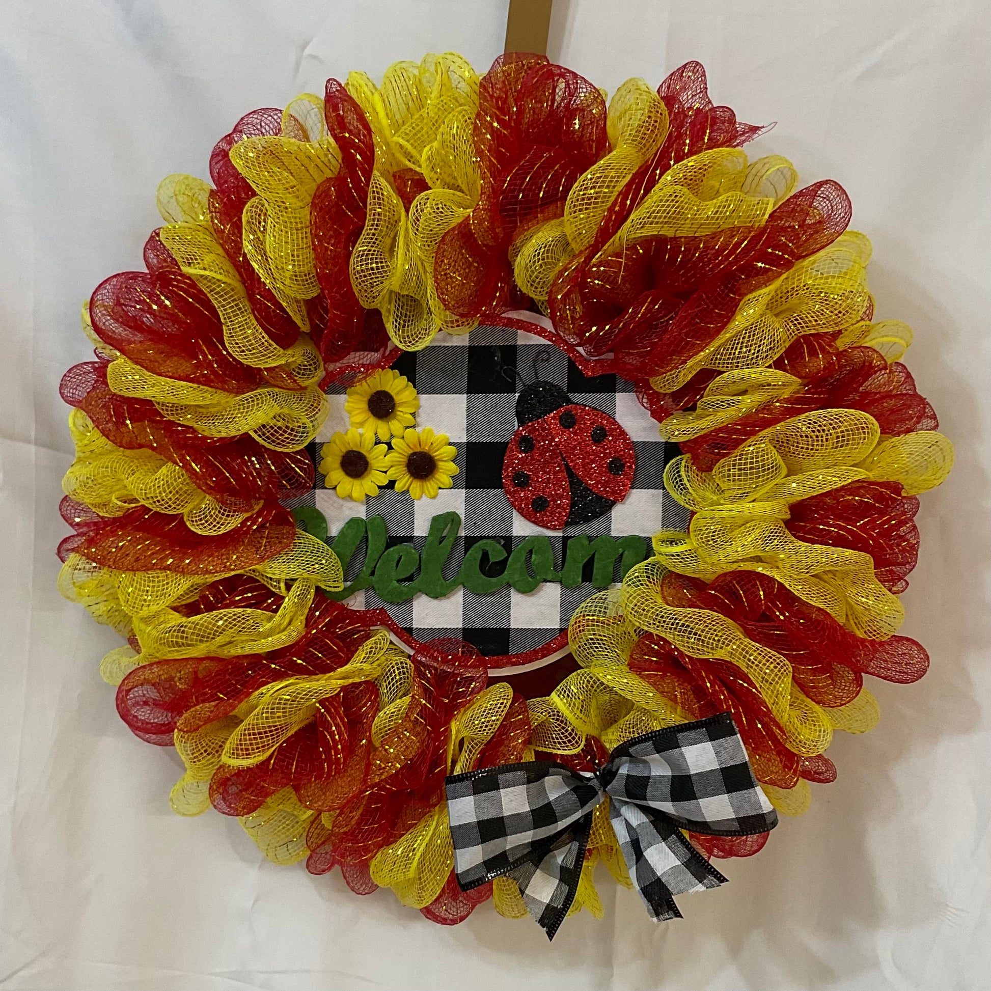Welcome warm days and sunny smiles with our 19-inch ‘Ladybug Welcome’ Summer Wreath! Handcrafted with swirls of cheerful yellow and fiery red mesh, this wreath brings the perfect pop of sunshine to your door. At its heart is a charming buffalo check center, adorned with a glittery ladybug, sunny daisies, and a bold green 'Welcome' greeting. A matching black-and-white gingham bow ties the whole look together for a whimsical farmhouse flair.