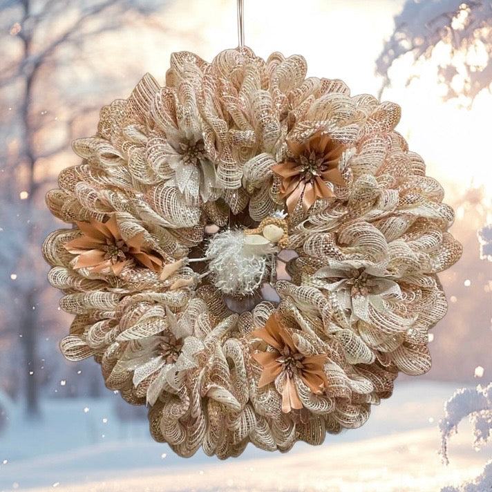 Materials: Deco mesh, soft metallic ribbon florals, angel ornament, integrated mini lights (battery powered)