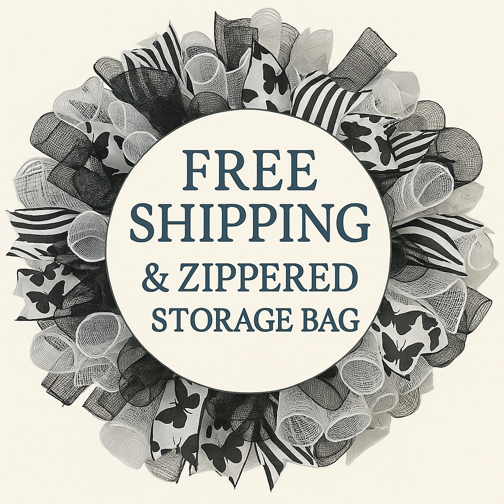 Bold meets beautiful in this stunning Monochrome Garden Wreath, a 25” handcrafted display of black and white elegance. Swirls of striped, floral, and sheer mesh ribbons dance around a center filled with fluttering butterflies and soft flower detailing, making this piece a true showstopper.