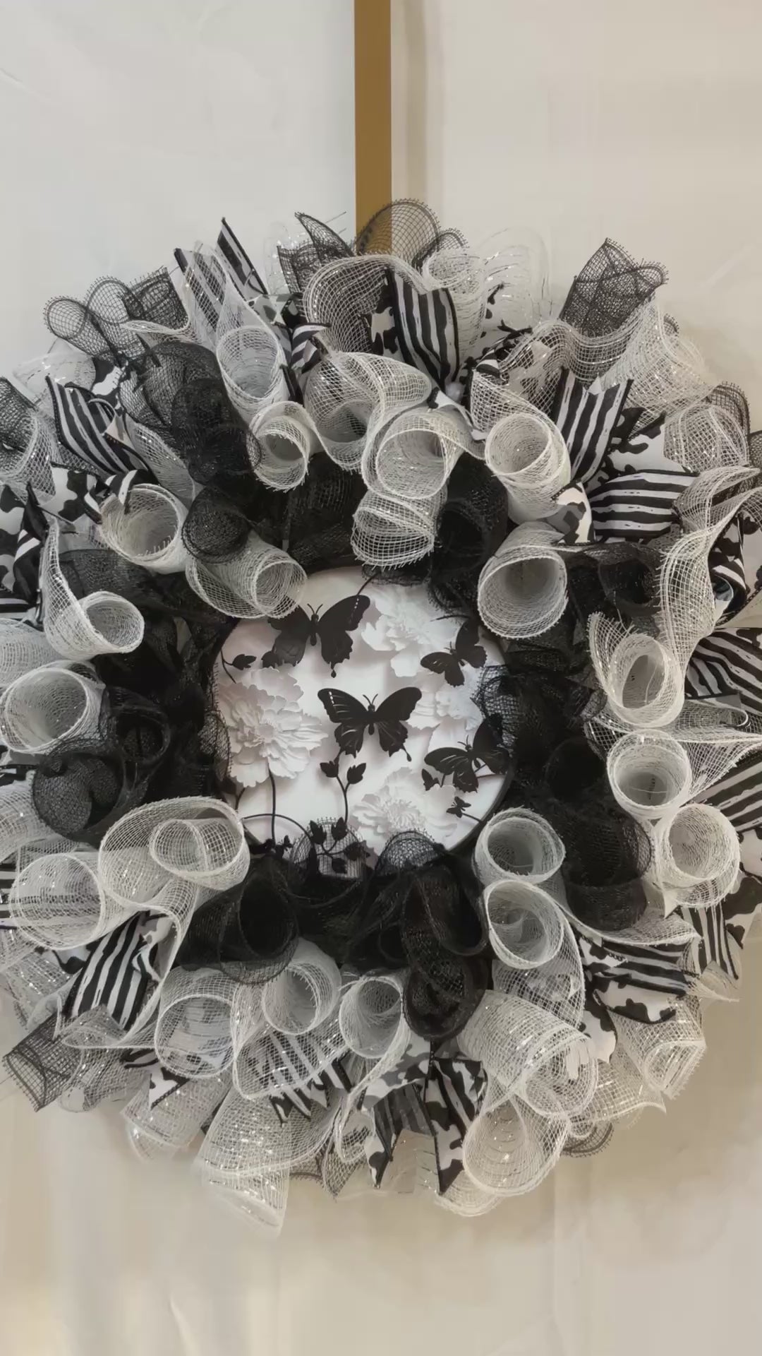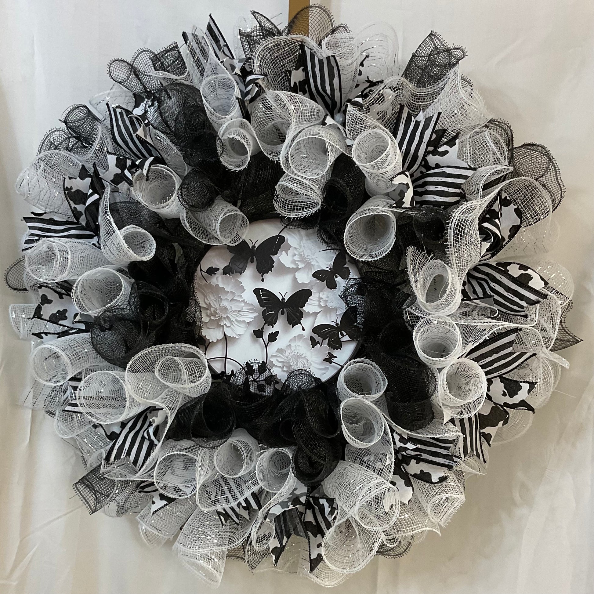 Monochrome Garden Wreath – 25” Black & White Butterfly Design