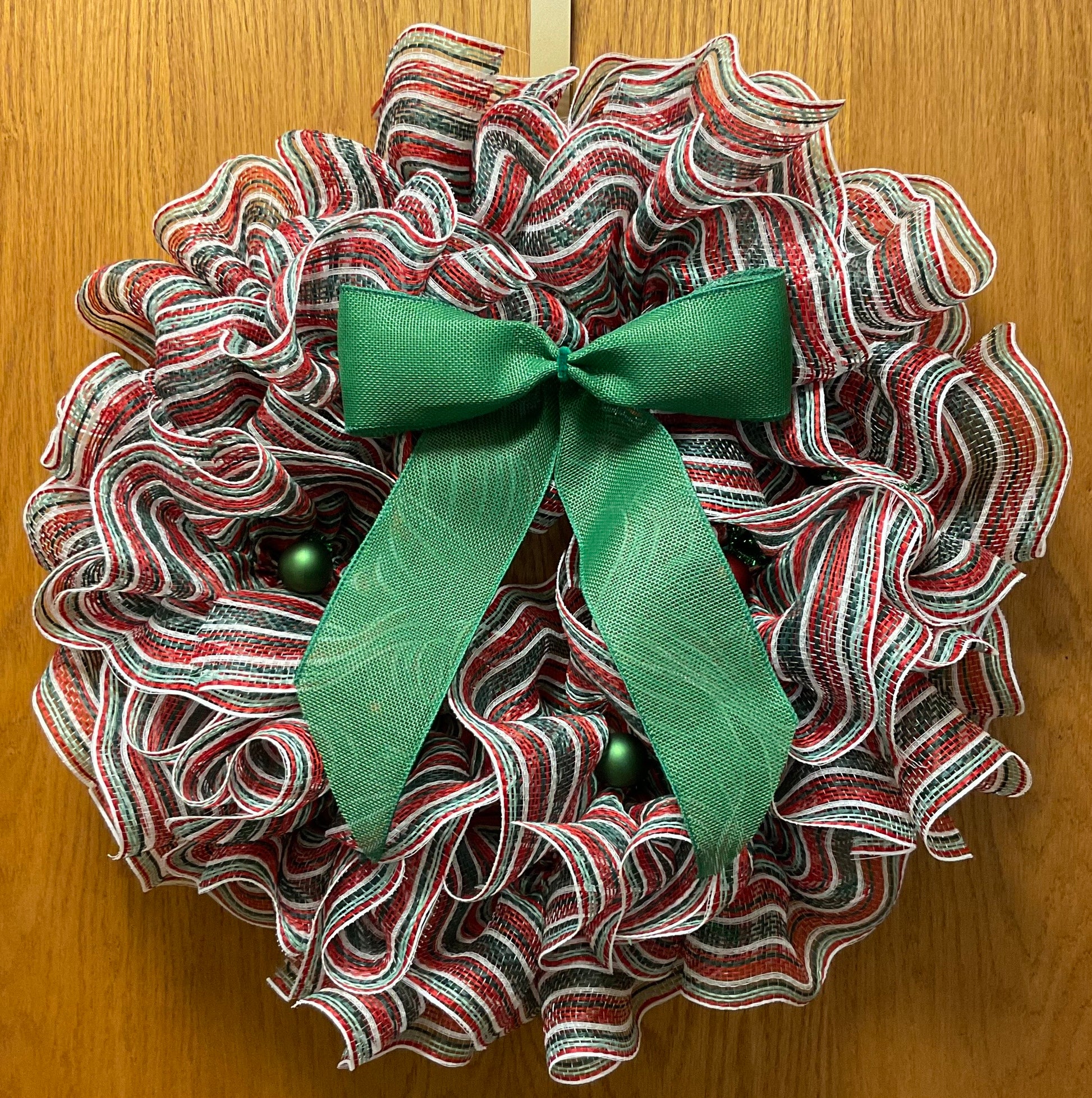 Peppermint Twist Holiday Wreath – 23” Christmas Mesh Wreath with Green Bow
