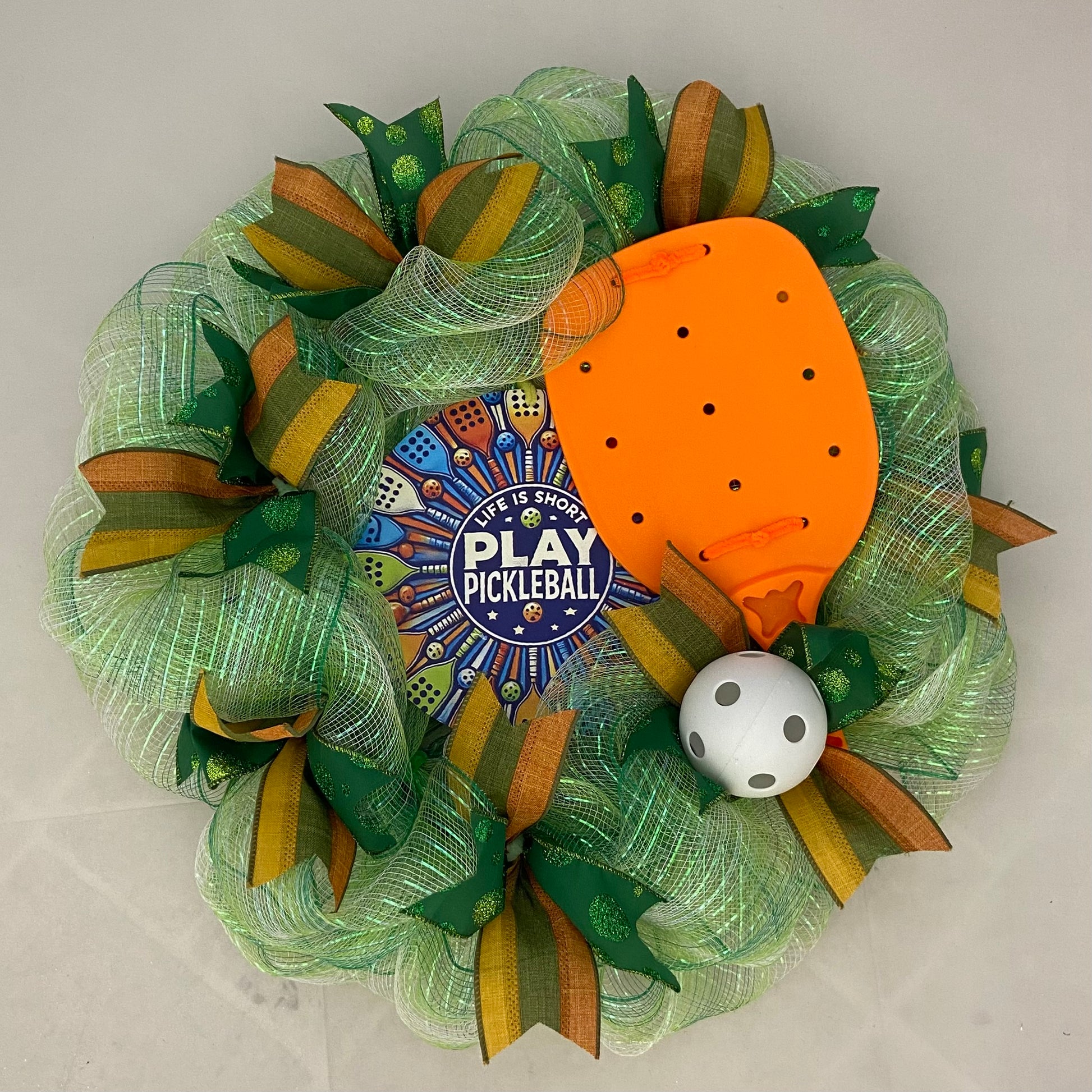 Serve up some serious style with our “Pickleball Party Wreath”! This 23” playful delight features a bright orange paddle, a classic whiffle-style ball, and a bold center sign that declares what we all know to be true: Life is short, play pickleball!With its lively ribbons and light green mesh, this wreath is a smashing hit for any front door, coach’s gift, tournament table, or club event.
