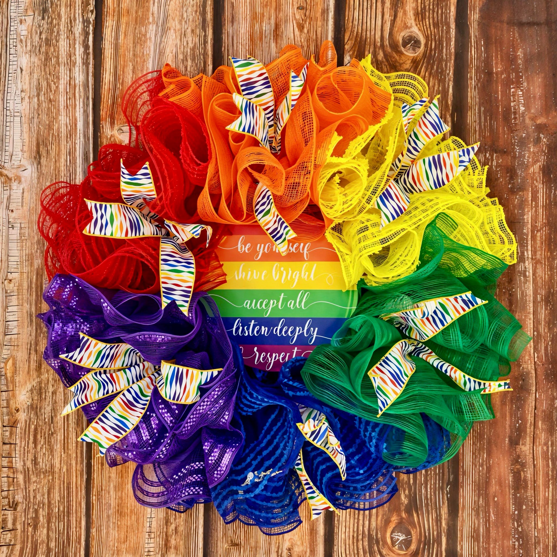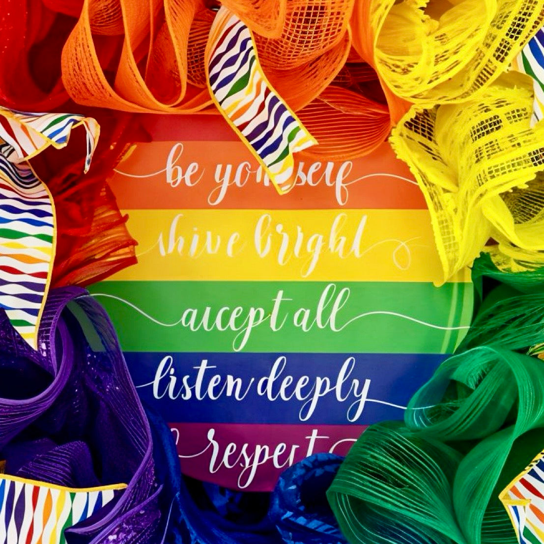 Brighten any space with this bold and joyful 24-inch Pride Wreath. Featuring a rainbow of vibrant mesh ruffles and striped ribbon bows, it centers around a beautifully lettered affirmation: be yourself, shine bright, accept all, listen deeply, respect always.