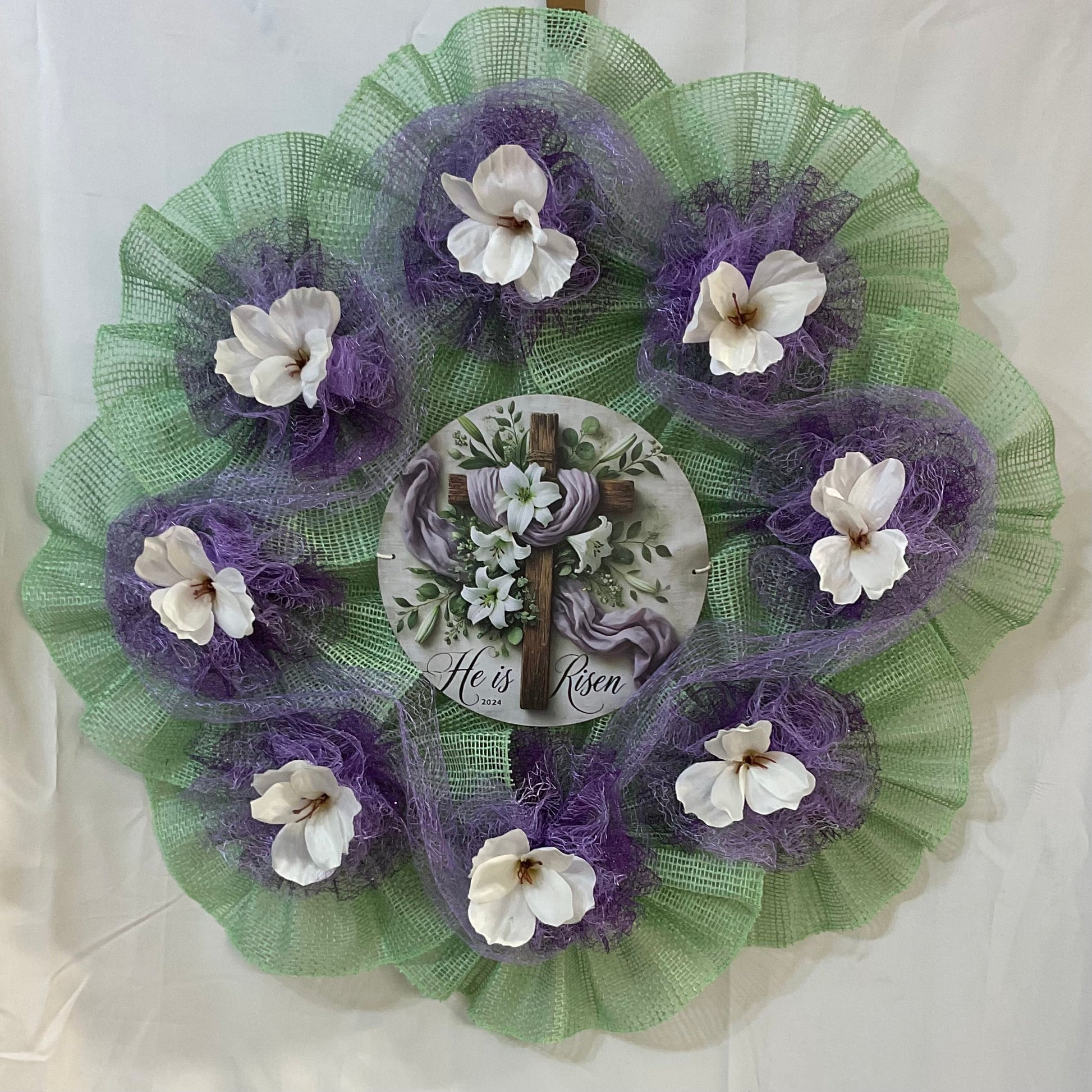 He Is Risen Wreath – 26” Easter Mesh with Cross & Florals