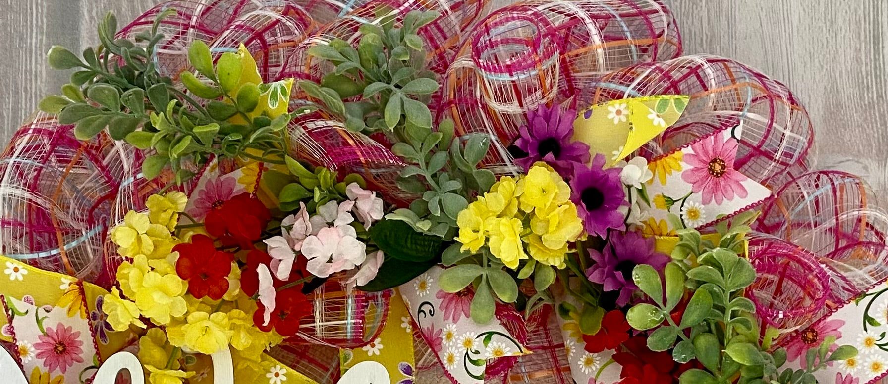 - Materials: Deco mesh, wired ribbon, artificial flowers, painted wood sign