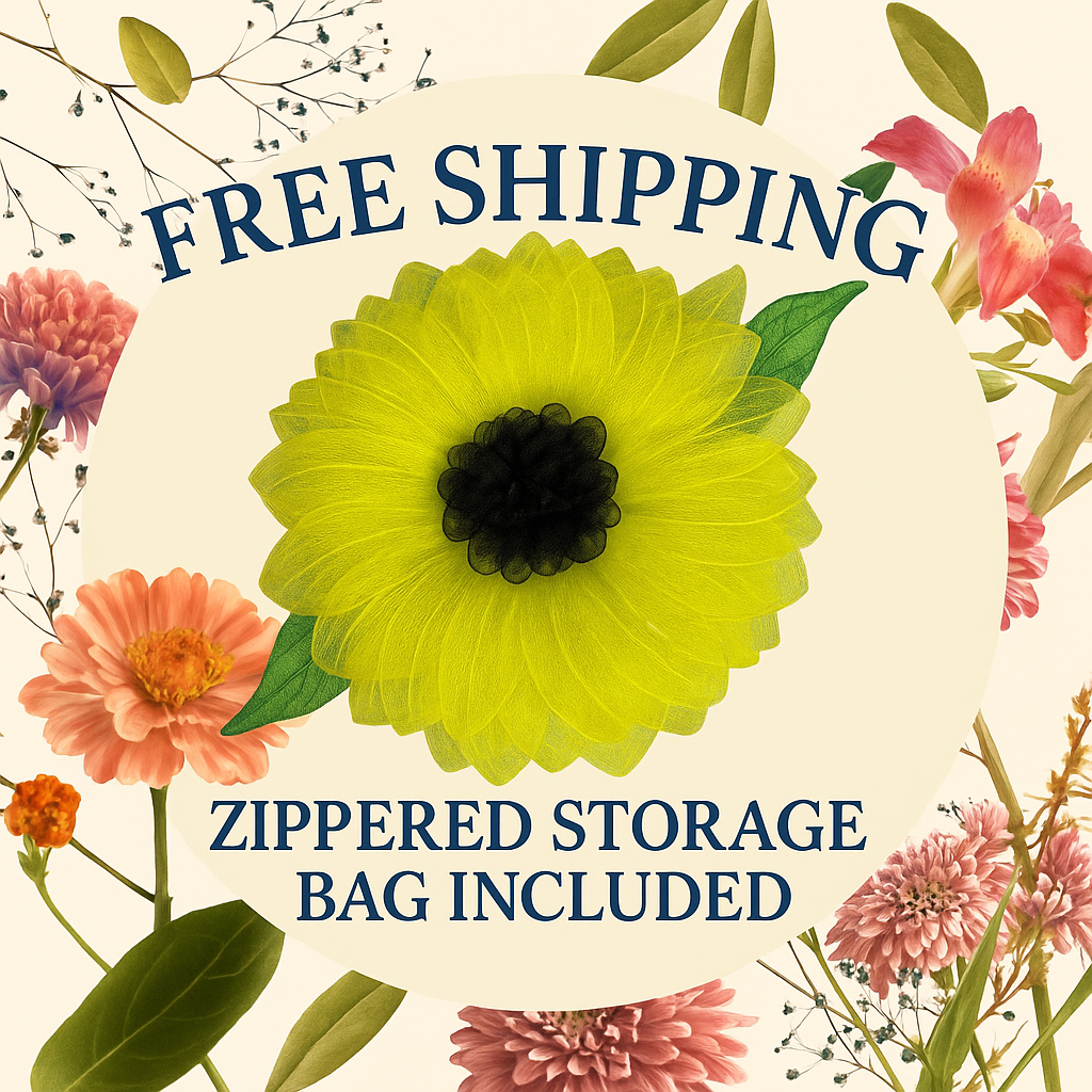 Meet your front door’s new favorite flower. The Golden Bloom Wreath is a cheerful 22-inch burst of sunshine, handcrafted to look like a giant sunflower that’s had one too many cups of summer joy. With layers of bright yellow mesh petals, leafy greens, and a bold black center puff, it’s practically smiling already.