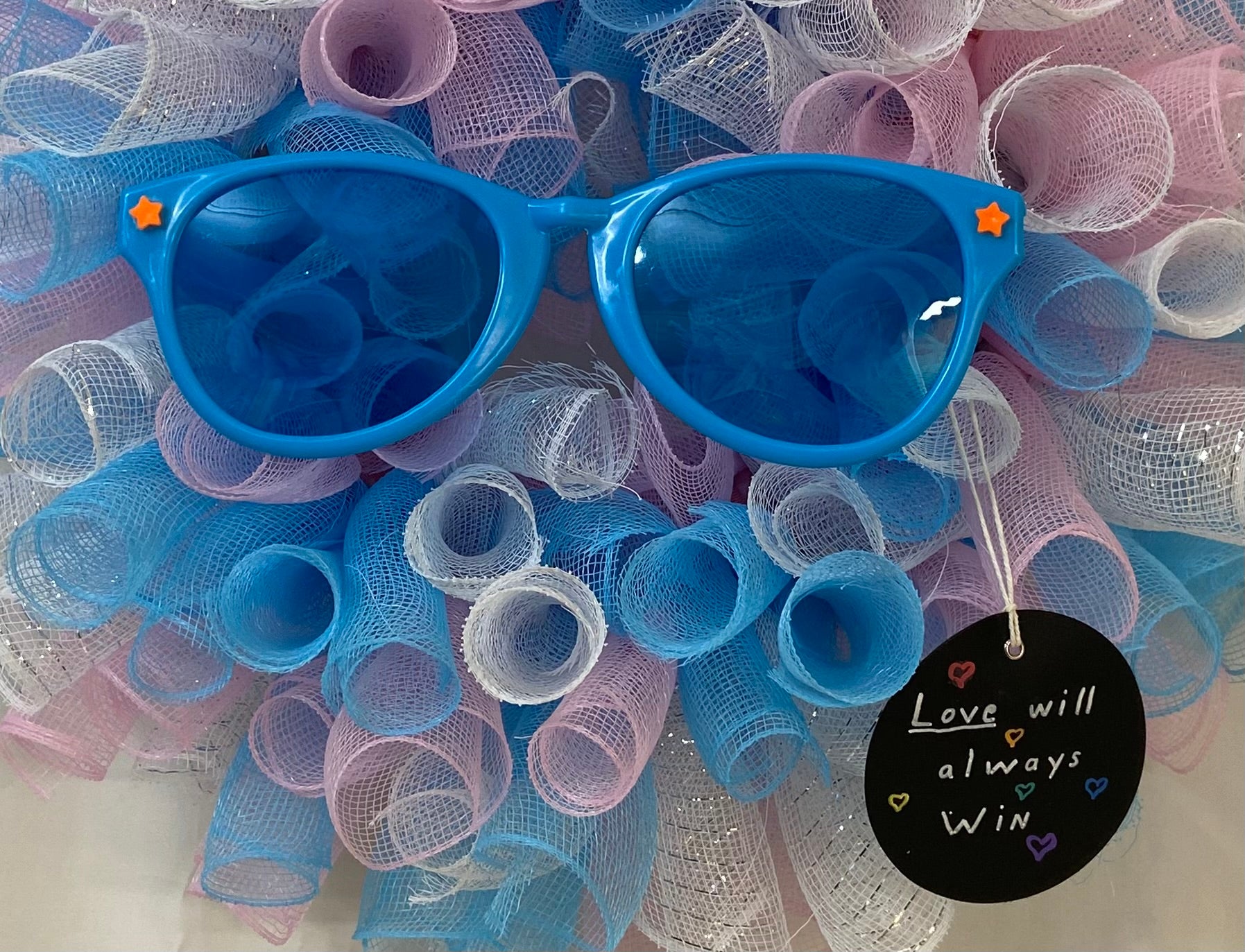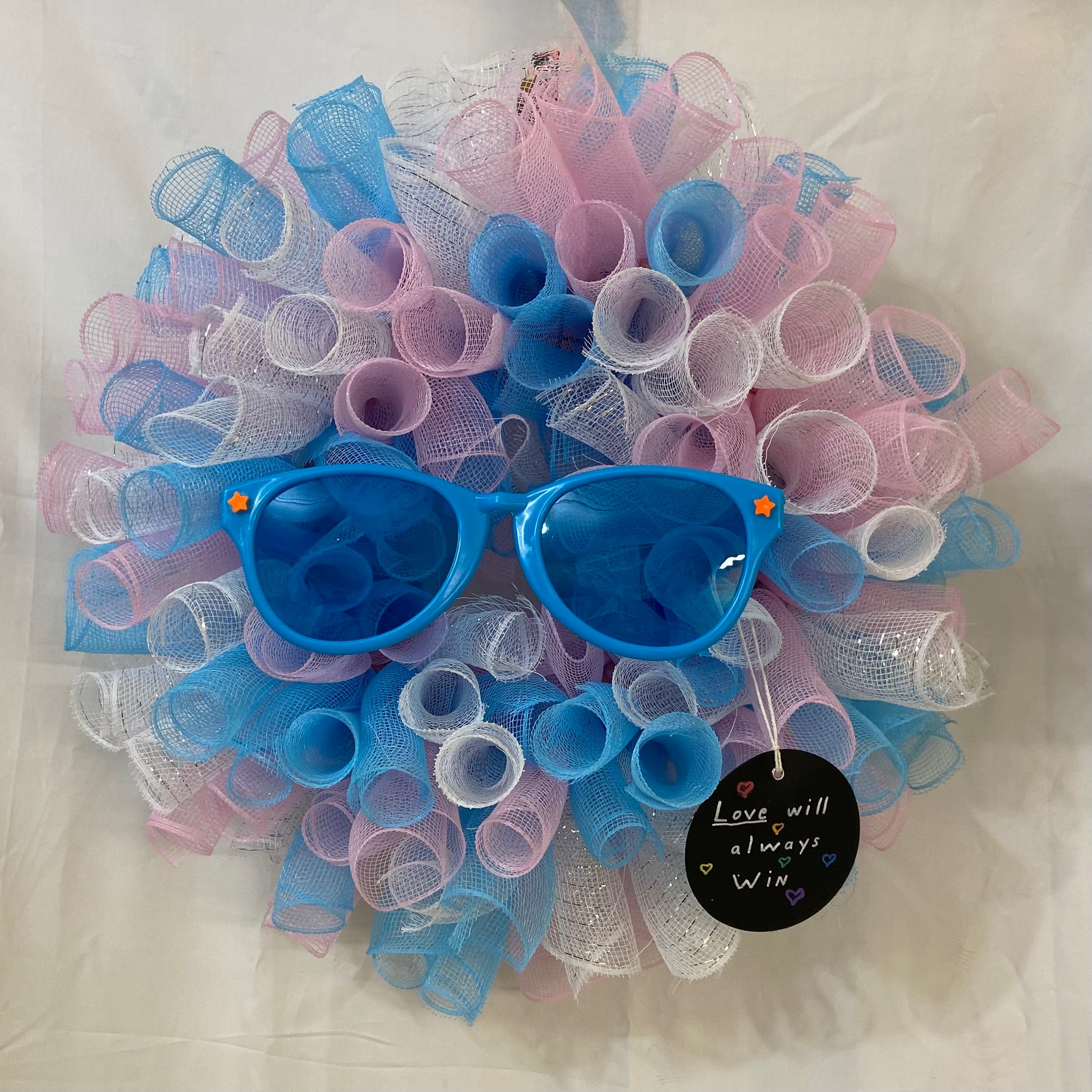 Celebrate visibility, joy, and identity with this bold and beautiful Trans Pride wreath. Made with soft spirals of blue, pink, and white mesh, this handmade wreath is a proud tribute to the trans community. The statement sunglasses and heart tag reading “Love will always win” add a playful and affirming touch — perfect for your front door, gallery wall, or pride celebration.