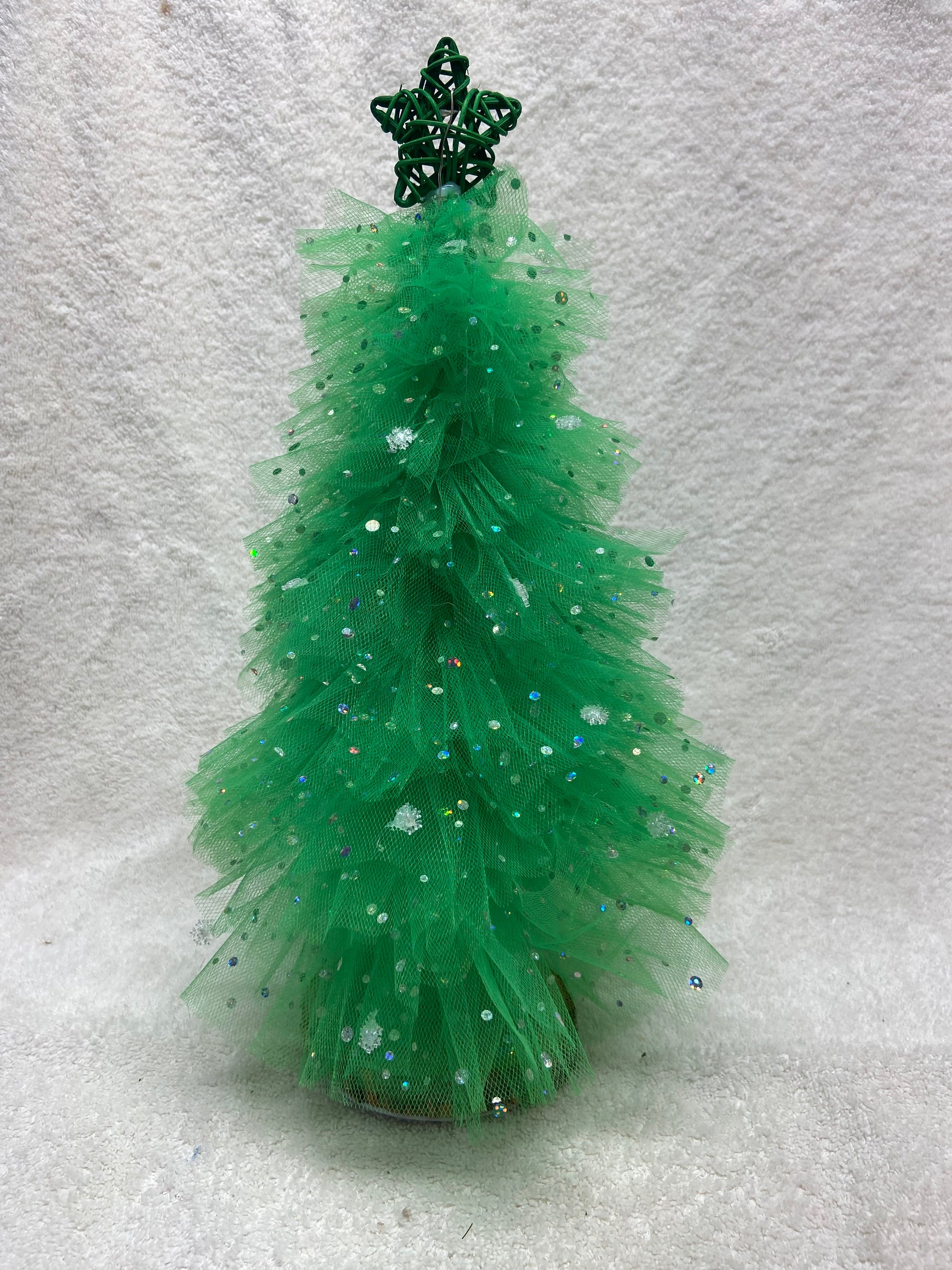 Twinkle Evergreen – 15” Green Tulle Whimsy Tree with Sequins & Star Topper