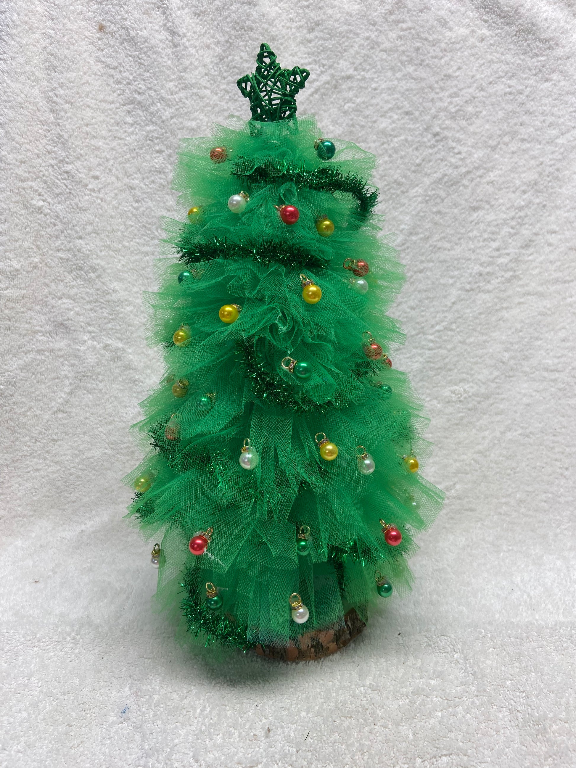 Decked in pearls and merry delight, our “Holiday Jubilee” Whimsy Tree brings classic Christmas cheer to every corner it graces. Standing proudly at 15 inches, this tree is layered in lush green tulle, wrapped in sparkling garland, and dotted with miniature pearl ornaments in festive hues. Topped with a bright green woven star, she’s everything nostalgic, merry, and handmade.