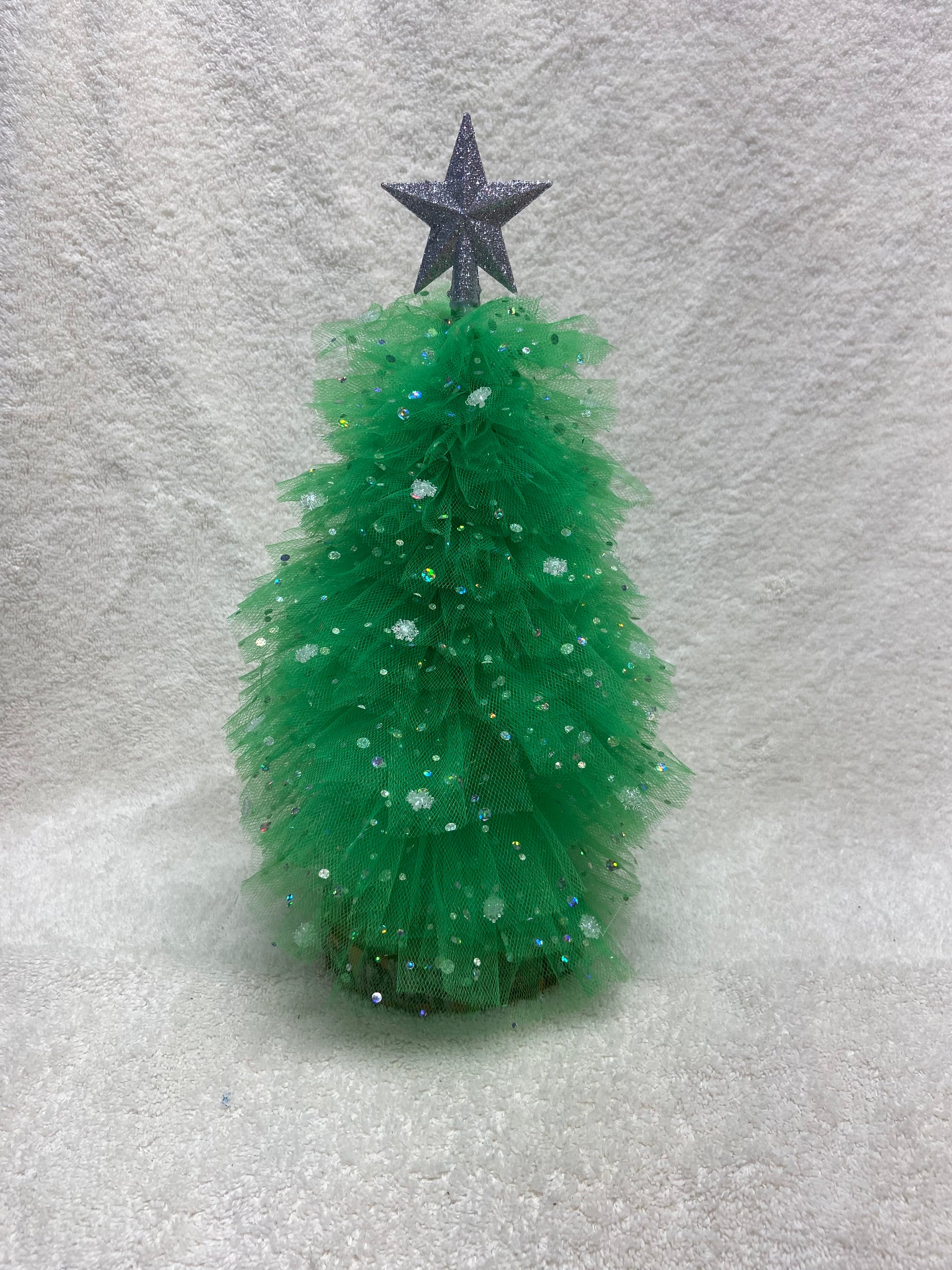 Twinkle, shimmer, and shine—our “Starlight Evergreen” Whimsy Tree is a 13” vision of timeless holiday magic. Handcrafted from layered green tulle, each branch is kissed with a dusting of snow-like sequins and holographic sparkle that dances in the light. Crowned with a silver glitter star, this classic tree is elegance with a wink of enchantment.