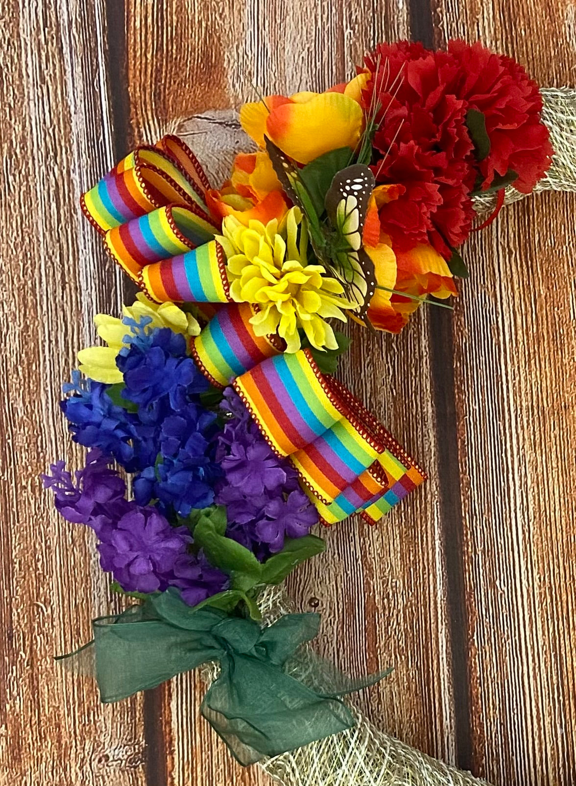 - Features faux flowers, rainbow ribbon, and butterfly detail