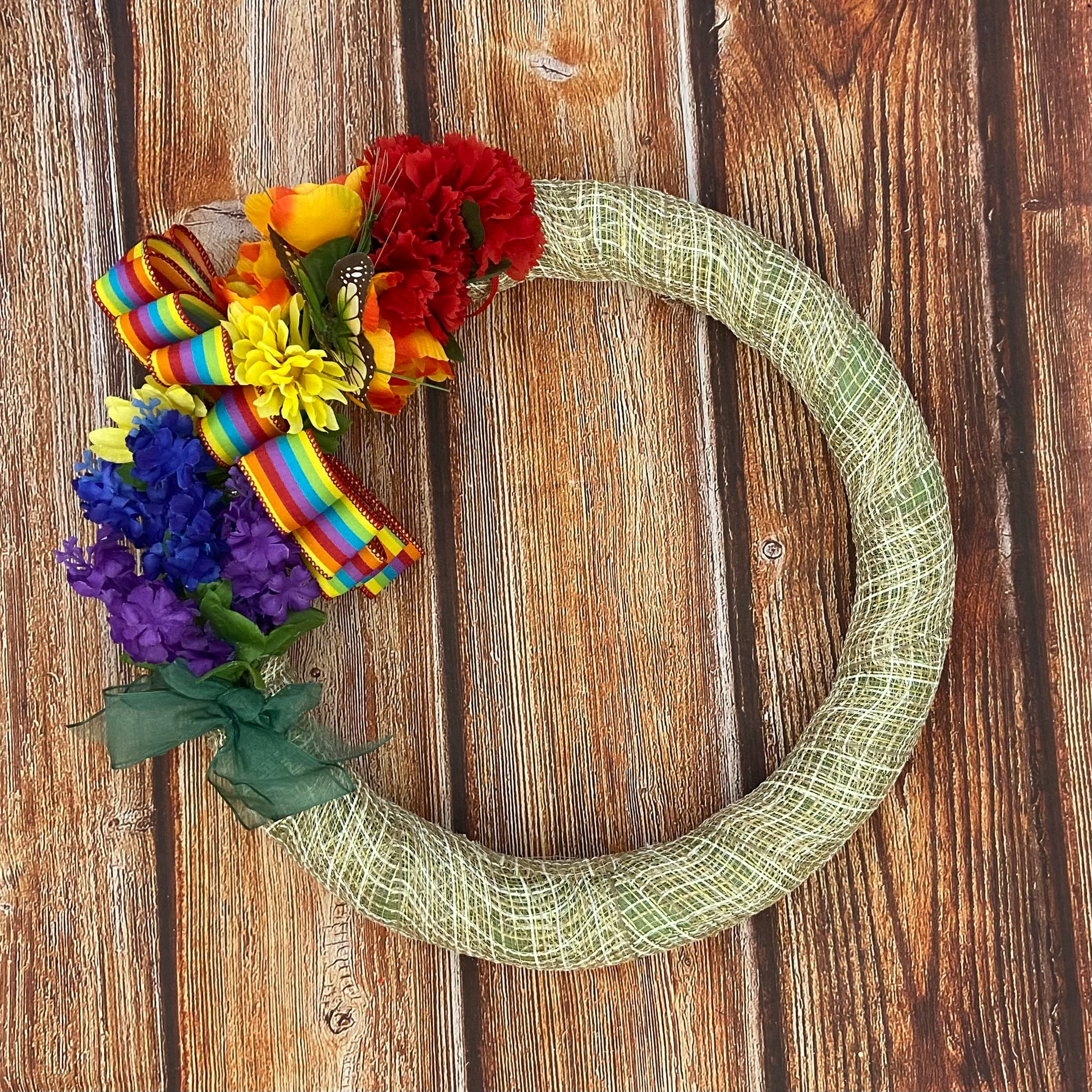 This 20” handcrafted wreath blends earthy elegance with vibrant joy. Wrapped in soft green mesh and crowned with rainbow florals, a butterfly, and a bright pride ribbon, Whispers of Pride brings a natural, grounded beauty to your space. It’s a subtle but powerful statement of love, identity, and unity—perfect for your front door, studio, or pride altar.