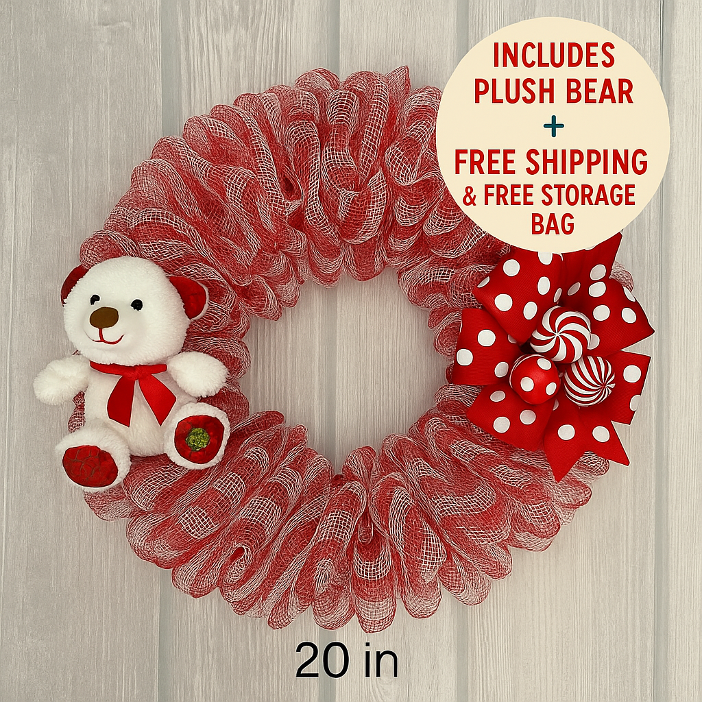 A little sweetness goes a long way! Candy Bear Cheer is a 20-inch Christmas wreath that brings whimsy and warmth with every loop of red and white mesh. Nestled in the bottom corner is an adorable plush teddy bear, ready to greet guests with holiday joy. Opposite, a playful bow bursts with peppermint-striped balls and polka-dot ribbon for a candy-cane-inspired touch. It’s soft, joyful, and sure to make hearts smile.