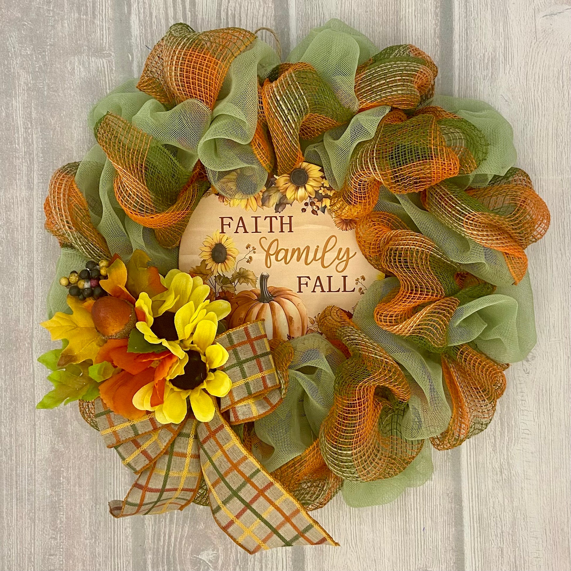 Celebrate the heart of the season with the Faith, Family, Fall Wreath—a 20-inch design filled with warmth and gratitude. Crafted from soft green and rustic orange mesh, this wreath centers around a wooden-style sign featuring sunflowers, pumpkins, and the words “Faith, Family, Fall.” A mix of fall florals, berries, and a plaid bow add depth and texture, making it the perfect pairing for your tabletop wreathlet or a beautiful standalone piece.