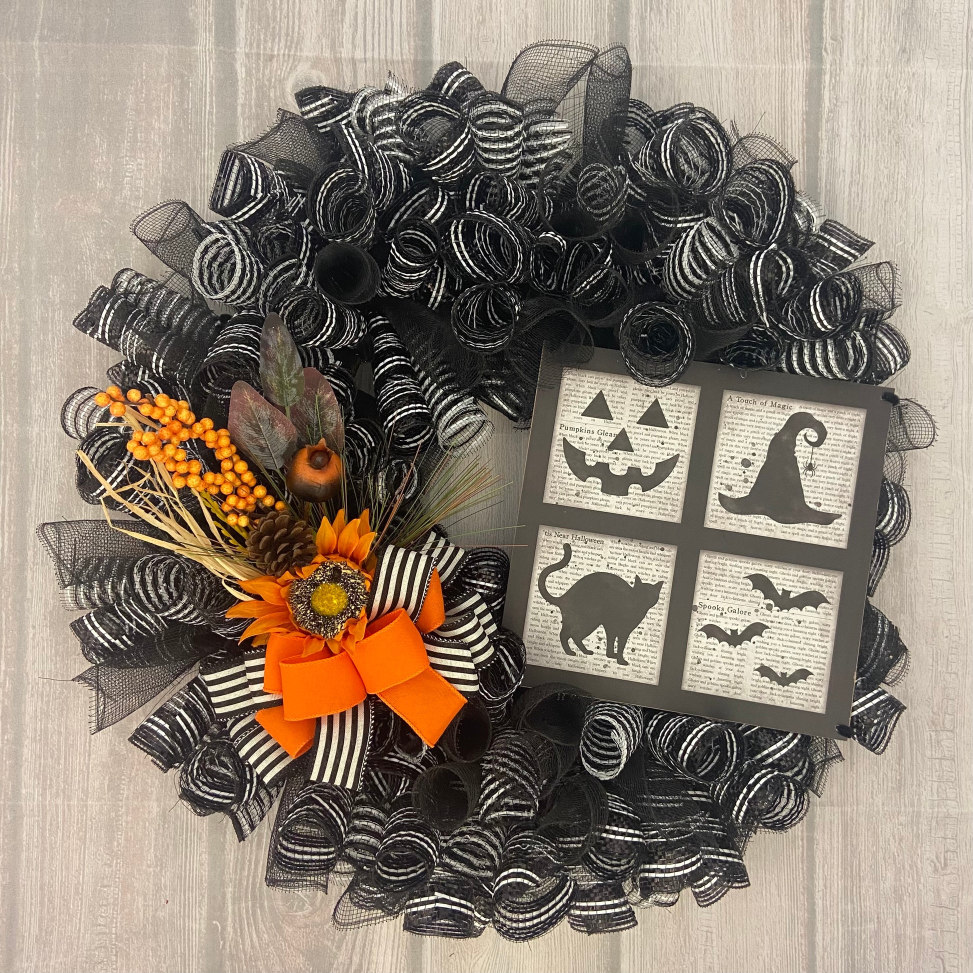 Rich black and white striped mesh creates a dramatic, swirling backdrop, while the vibrant orange bow and sunflower bring just the right pop of festive color. A playful Halloween sign featuring vintage-style silhouettes—jack-o’-lanterns, a black cat, a witch’s hat, and fluttering bats—adds a touch of spooky charm to complete the scene.